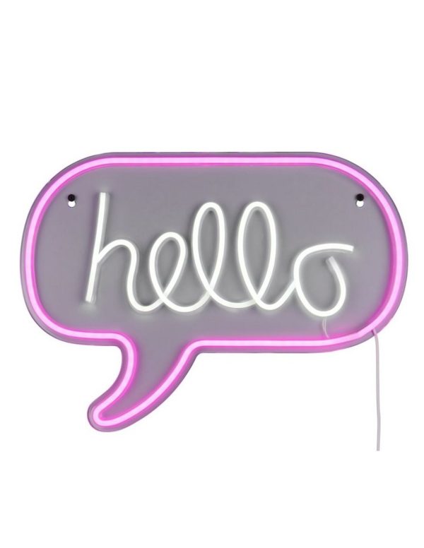Luz decorativa LED tipo neón rosa con diseño HELLO, fabricada en plástico transparente. Bajo consumo de 2W, conexión USB-C con interruptor y estilo moderno ideal para interiores.