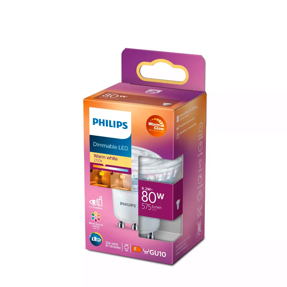 Bombilla Dicroica LED GU10 80W Equivalente 2200K–2700K White Glow 36° Regulable – Philips