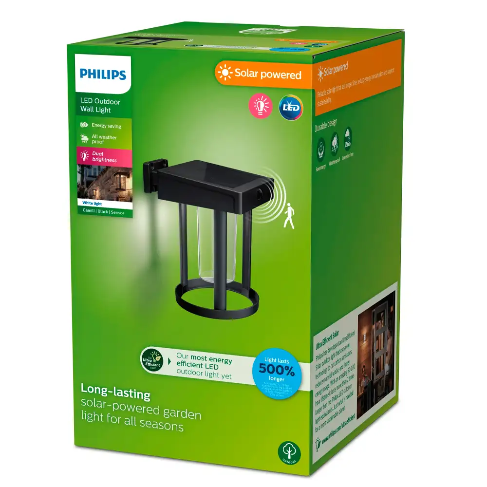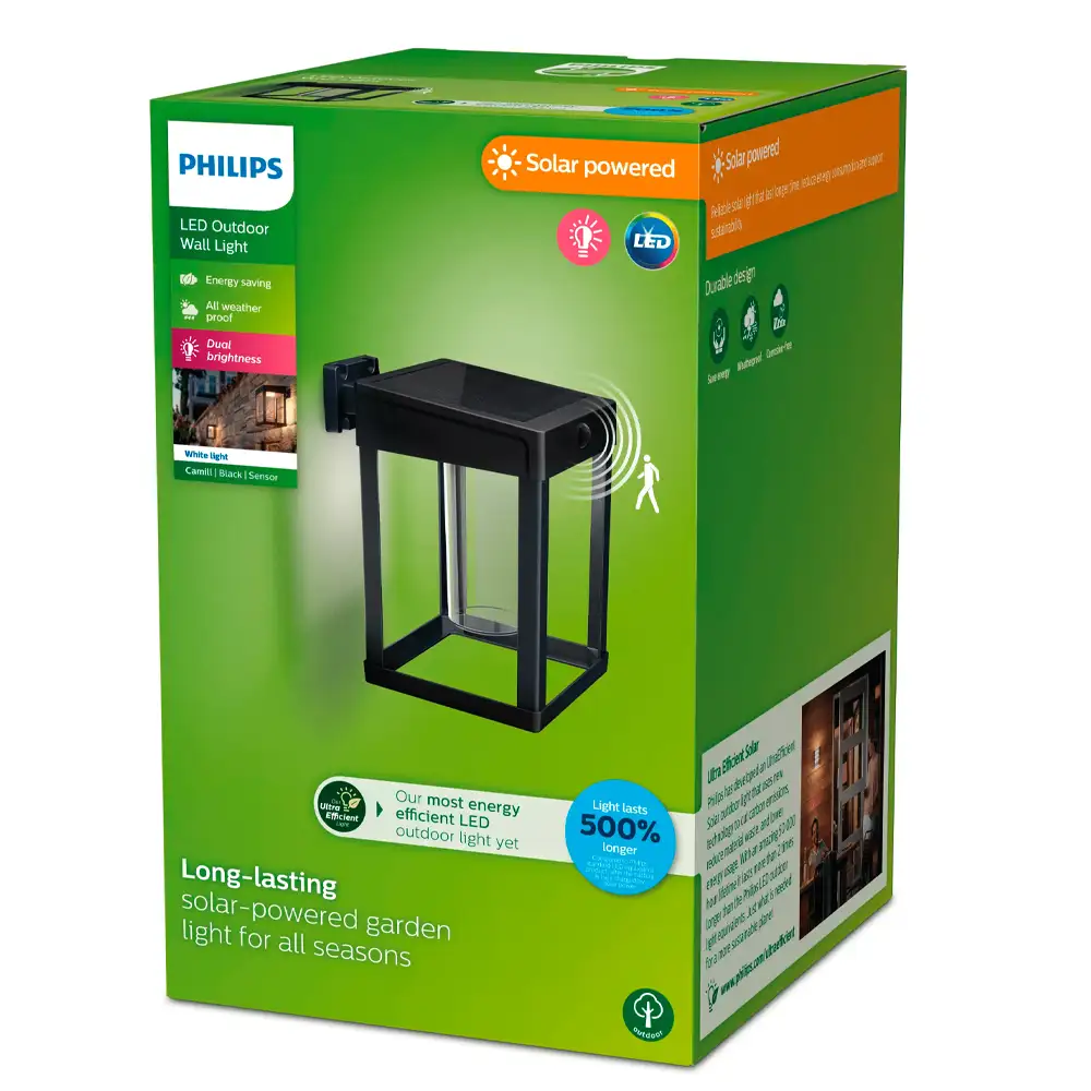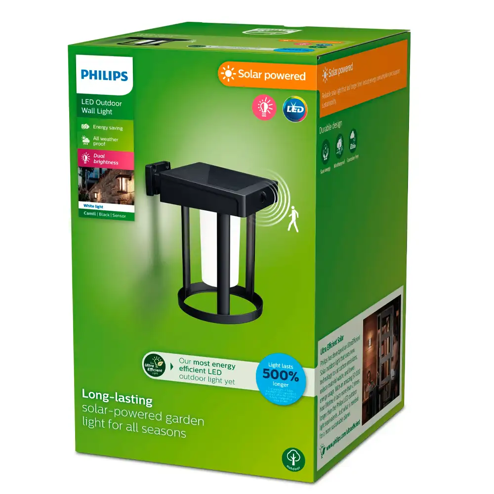 Aplique Camill C LED 1×1,4W 3000K Solar Ultra Eficiente con Sensor Negro T IP44 – Philips
