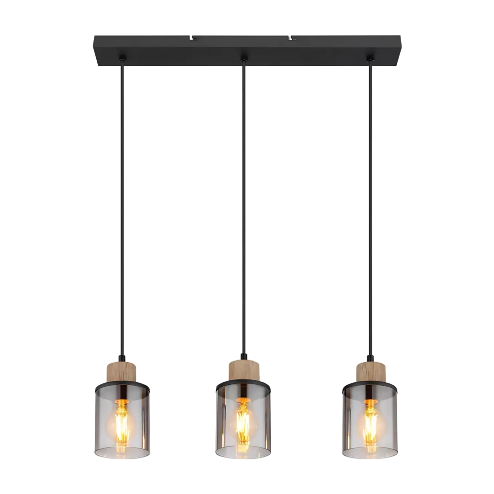 Lámpara de Techo de Madera y Negro con 3 Luces E27 y Tulipas de Cristal Cilíndrico Fumé IP20 Interior – Campiluz