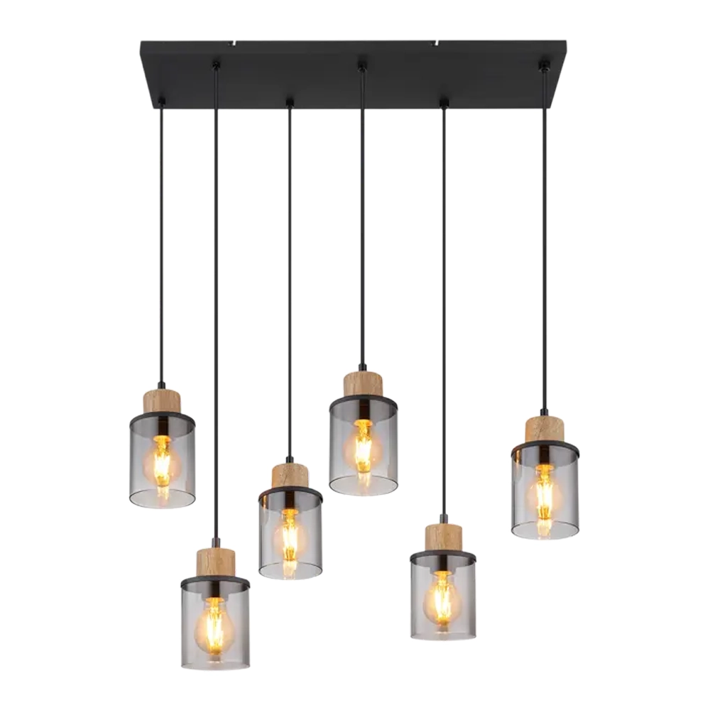 Lámpara de Techo de Madera y Negro con 6 Luces E27 y Tulipas de Cristal Cilíndrico Fumé IP20 Interior – Campiluz