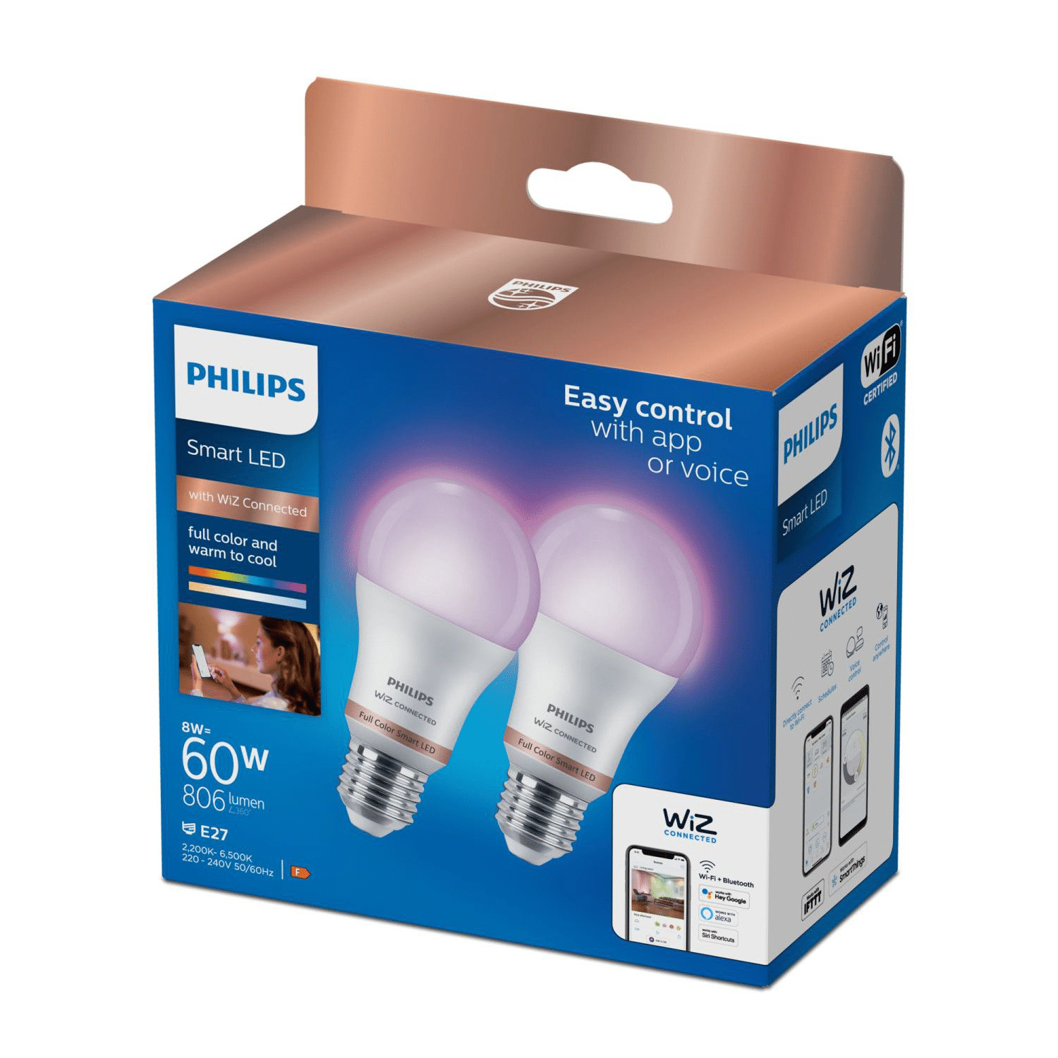 Pack 2 Bombillas LED A60 Philips WiZ RGB 2200K–6500K 8W E27 Mate