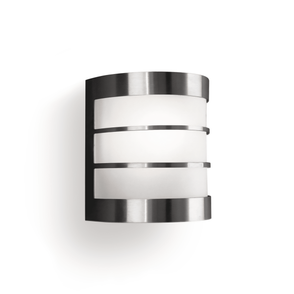 Aplique Calgary Philips en níquel con casquillo E27 e IP44. Sin bombilla incluida. Ideal para entradas, terrazas y zonas exteriores gracias a su diseño resistente.