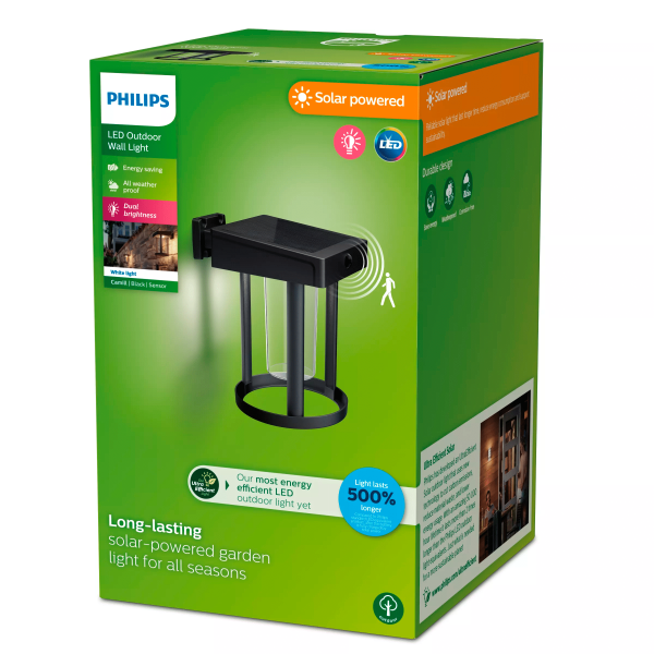 Aplique solar Camill R Philips con sensor, 1,4W y luz cálida 3000K. Ultra eficiente, sin cableado, IP44 y diseño negro con difusor transparente.