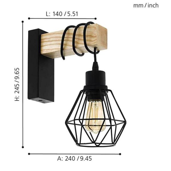 El aplique colgante de pared Townshend 5 de Eglo Iluminación destaca por su diseño retro de inspiración industrial, combinando una estructura de acero negro con un soporte de madera en tono natural. Su estética sencilla y robusta lo convierte en una pieza decorativa ideal para aportar personalidad a cualquier pared interior. Este aplique funciona con una bombilla de casquillo E27 (no incluida), recomendándose el uso de una bombilla LED de filamento y tono cálido para potenciar su carácter vintage. Incorpora un cable negro flexible cuya altura puede regularse enrollándolo sobre la estructura de madera, permitiendo personalizar la caída de la bombilla hasta una altura máxima de 24,5 cm. El aplique Townshend 5 es fácil de instalar y perfecto para espacios domésticos y comerciales como salones, comedores, restaurantes, bares o tiendas. Combina especialmente bien con decoraciones en tonos negros, grises y marrones, así como con otros modelos de la colección Townshend. Diseñado para uso interior y con protección IP20, es una solución decorativa funcional que une iluminación y diseño con un marcado estilo vintage.Especificaciones técnicas