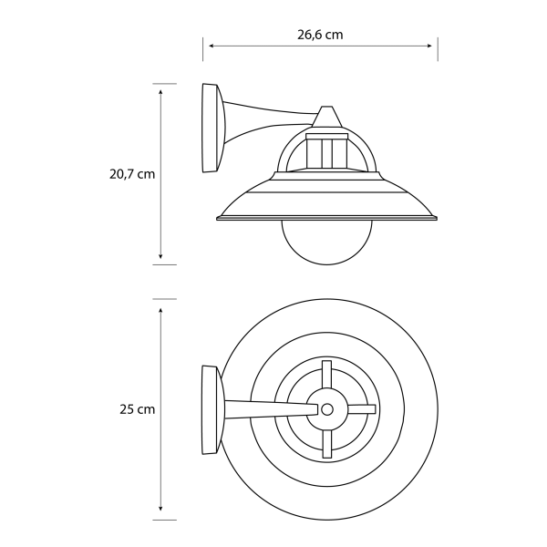 Fabricado en aluminio negro, ofrece gran durabilidad y un acabado estético que combina con cualquier estilo exterior. Sus dimensiones de 26,6 × 26,6 × 25 cm proporcionan presencia sin resultar voluminoso.