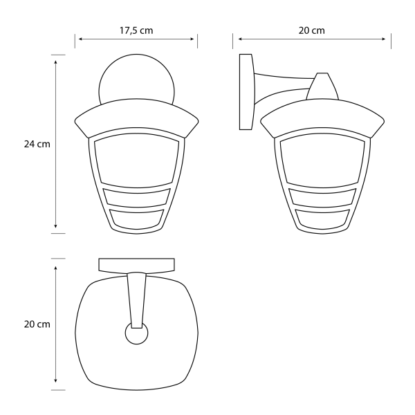 Fabricado en aluminio negro, destaca por su resistencia y su acabado elegante. Sus dimensiones de 17,5 × 20 × 24 cm permiten instalarlo fácilmente en cualquier pared exterior.