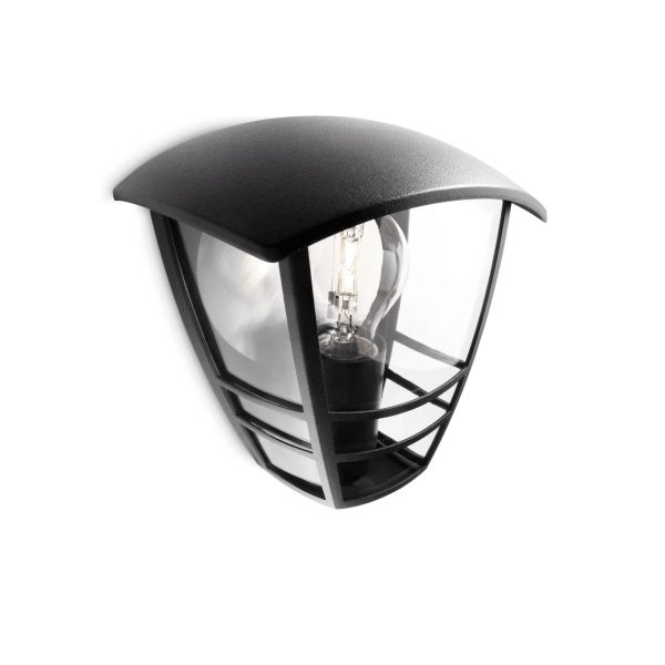 Aplique Creek Philips en color negro con casquillo E27 y diseño clásico compacto. Apto para bombillas hasta 60W y protección exterior IP44.