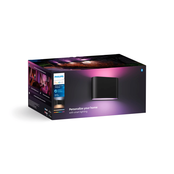 Aplique exterior Dymera Philips HUE negro, 10,2W y 1020 lúmenes. LED integrado, IP44 y luz blanca o de color. Control inteligente por Bluetooth y Zigbee.
