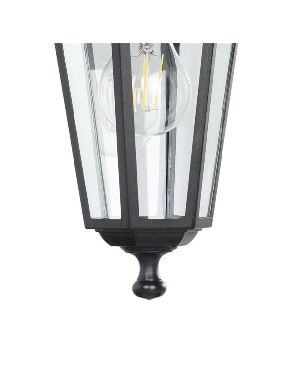Diseño tipo farol clásico con cuerpo de aluminio fundido negro, ideal para exteriores IP44, compatible con bombilla E27 y montaje en pared o esquina.