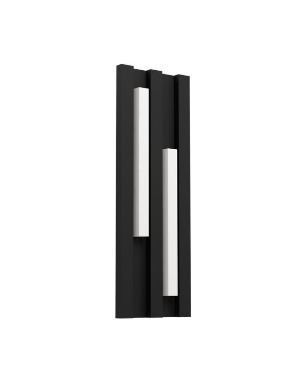 Iluminación LED exterior bidireccional de 1000 lúmenes con luz cálida 3000K, diseño negro moderno en acero galvanizado y protección IP55 para fachadas resistentes.