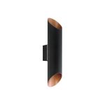 Iluminación LED bidireccional integrada de 640 lúmenes con luz cálida 3000K, cuerpo de acero galvanizado negro y cobre, protección IP44, ideal para fachadas y jardines exteriores.