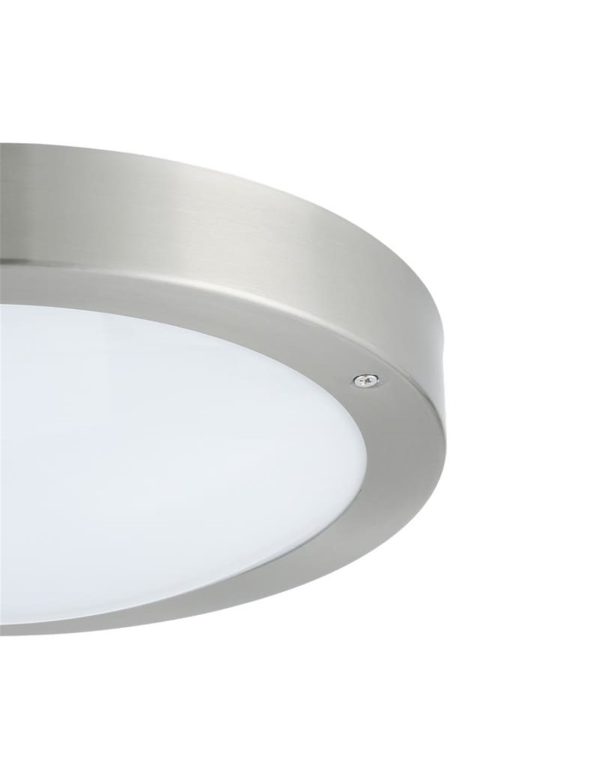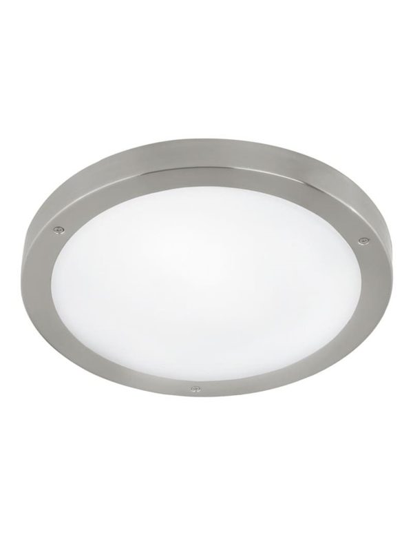 Iluminación LED integrada de 1300 lúmenes con luz blanco cálido 3000K, formato redondo grande en acero inoxidable, ideal para techos exteriores por su protección IP44 resistente.