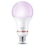 La bombilla Philips Smart LED WiZ A67 ofrece 1521 lúmenes y un rango de blanco ajustable entre 2700K y 6500K. Su alta luminosidad permite iluminar estancias amplias con una luz cálida, neutra o fría según cada actividad.