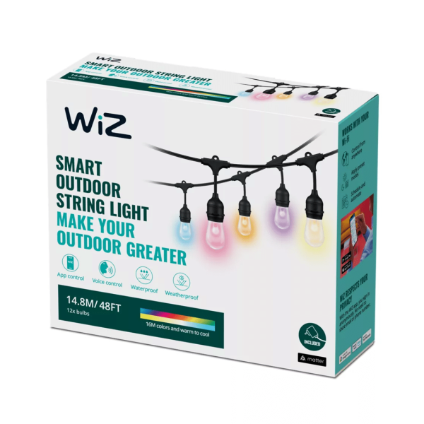 Guirnalda Exterior 12 luces Philips WiZ con iluminación 2700-5000K RGB, conectividad WiFi-Bluetooth, protección IP65 y bajo voltaje para uso seguro en exteriores.