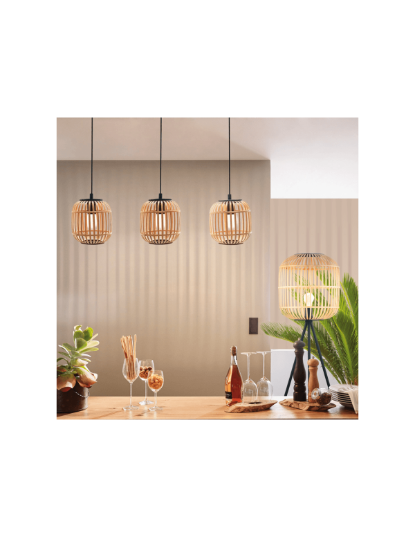 Pantallas de bambú natural con estructura de metal negro, compatible con tres bombillas E27, ideal para comedores y salones interiores de estilo boho con protección IP20.