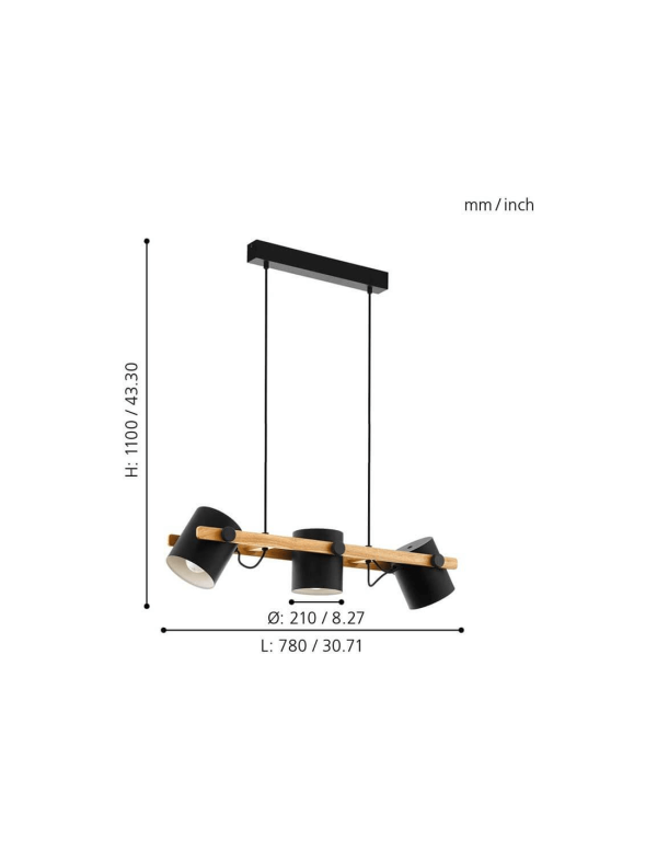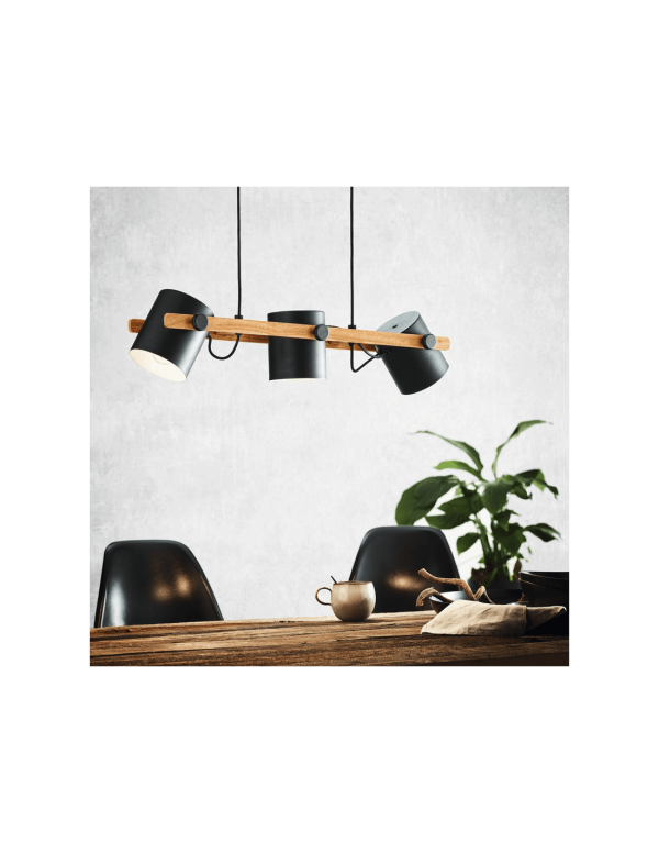 Esta lámpara colgante de techo es una solución decorativa y funcional para iluminar espacios interiores con un marcado estilo nórdico. Cuenta con tres focos colgantes orientables que permiten dirigir la luz según las necesidades del espacio, ofreciendo una iluminación versátil y personalizada. Funciona con bombillas E27 (no incluidas), lo que permite elegir el tono y la intensidad de luz más adecuados para cada ambiente. Su diseño combina metal negro con madera en tono marrón, creando un equilibrio perfecto entre calidez natural y estética moderna. Los focos se integran en una estructura lineal sostenida por dos barras de madera y un baldaquín metálico negro que se fija al techo. Esta combinación la convierte en una opción ideal para salones, comedores, pasillos amplios o dormitorios, así como para espacios comerciales con decoración contemporánea. Diseñada para uso interior, dispone de protección IP20 y una altura regulable hasta 110 cm, adaptándose fácilmente a diferentes alturas de techo. Su formato alargado de 78 cm permite una distribución uniforme de la luz, especialmente sobre mesas o zonas de paso. Es una excelente opción de lámpara colgante nórdica de madera para quienes buscan funcionalidad, diseño y una iluminación con personalidad.Especificaciones técnicas