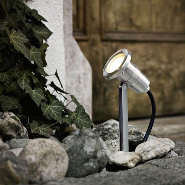 Foco exterior con estaca orientable y acabado en acero inoxidable, ideal para iluminar jardines y plantas con luz LED GU10 cálida y protección IP54.