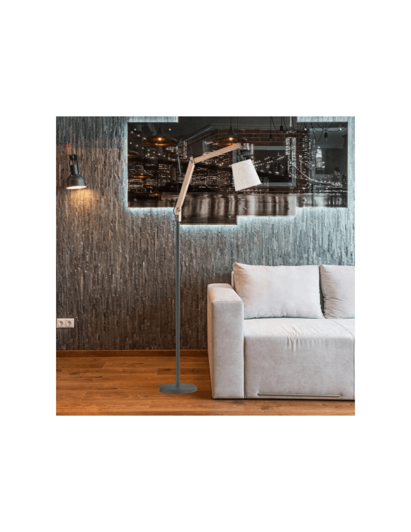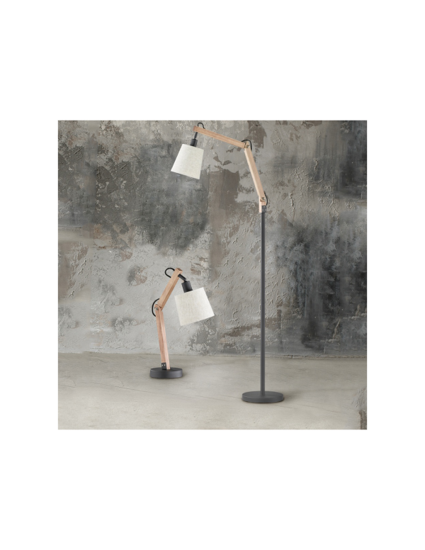 Gracias a su pie articulable, la Janko se adapta fácilmente a diferentes posiciones, proporcionando una iluminación funcional tanto para lectura como para luz ambiental. Su estilo combina elementos de madera y metal que se integran perfectamente en decoraciones rústicas, vintage o modernas con tonos naturales. Además, incluye interruptor de pie en el cable para un uso práctico y directo.