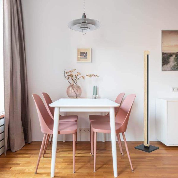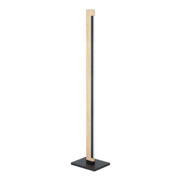 La lámpara de pie LED Camacho de Eglo Iluminación destaca por su estética contemporánea y líneas limpias, perfecta para quienes buscan una iluminación decorativa y funcional. Su estructura combina una base rectangular de acero negro mate con una placa vertical de madera, logrando un equilibrio visual elegante que se adapta a interiores modernos y minimalistas.