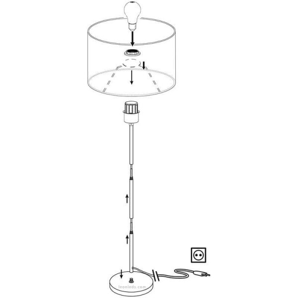 Cuenta con una estructura metálica robusta también en color negro y una altura de 151,5 cm, con un diámetro de pantalla de 38 cm, proporciones ideales para salones, dormitorios o zonas de lectura. Funciona con una bombilla LED E27 (no incluida), recomendándose una potencia entre 10W y 15W en tono cálido para potenciar su carácter decorativo y generar una luz ambiental confortable.