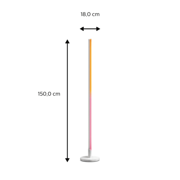 Con unas dimensiones de 18×18×150 cm, su estructura esbelta en acabado blanco encaja perfectamente en salones y dormitorios, aportando luz uniforme y un toque moderno.