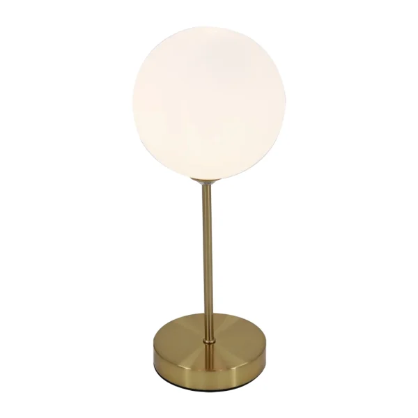 Acabado dorado elegante con tulipa opal que difunde una luz suave y uniforme, ideal para sobremesas interiores aportando estilo moderno, calidez visual y funcionalidad decorativa.