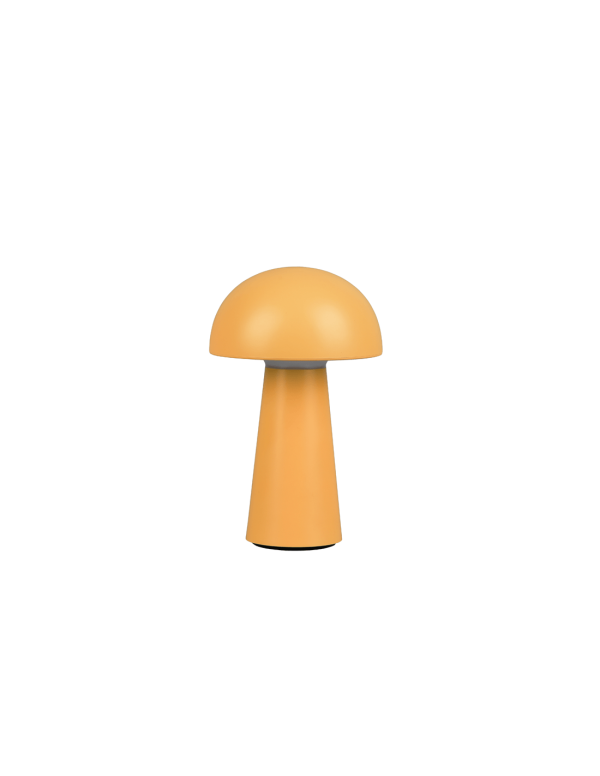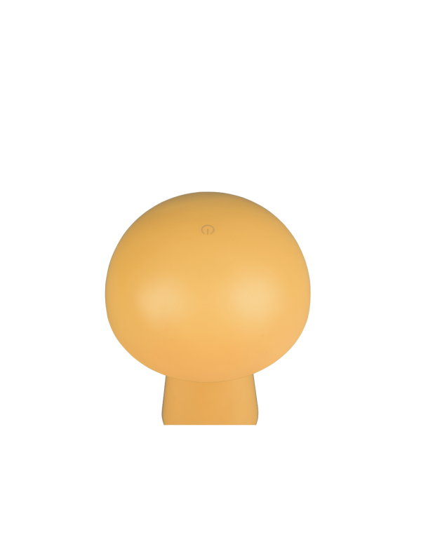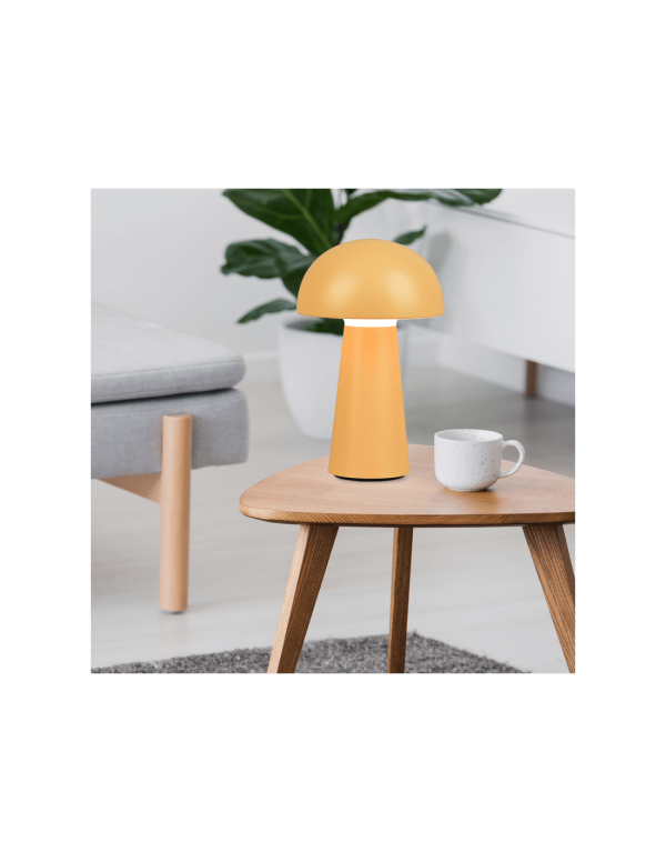 La lámpara de sobremesa LED LENNON en color amarillo ofrece 2W, luz cálida 3000K y diseño tipo seta. Es recargable, regulable y perfecta para interiores y exteriores gracias a su protección IP44.