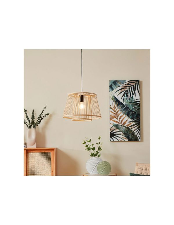 Esta lámpara de techo colgante destaca por su diseño elegante en madera, pensado para aportar personalidad y calidez a cualquier espacio interior. Su pantalla de 38 cm de diámetro permite una difusión uniforme de la luz, generando un ambiente acogedor y confortable tanto en estancias amplias como en zonas centrales del hogar.