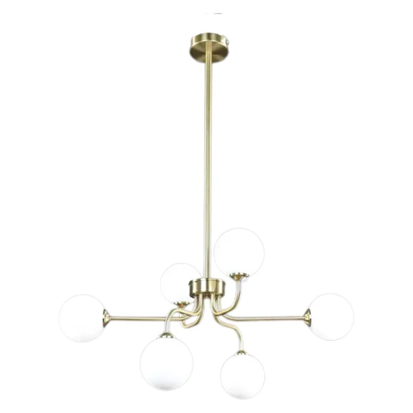 Estructura dorada con seis bolas de cristal opal que proporciona una iluminación decorativa equilibrada, ideal para salones y comedores interiores con estilo elegante.
