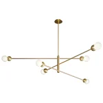 Estructura metálica en oro latón con ocho bolas opal que distribuyen una iluminación decorativa elegante y uniforme, ideal para salones y comedores interiores modernos amplios.
