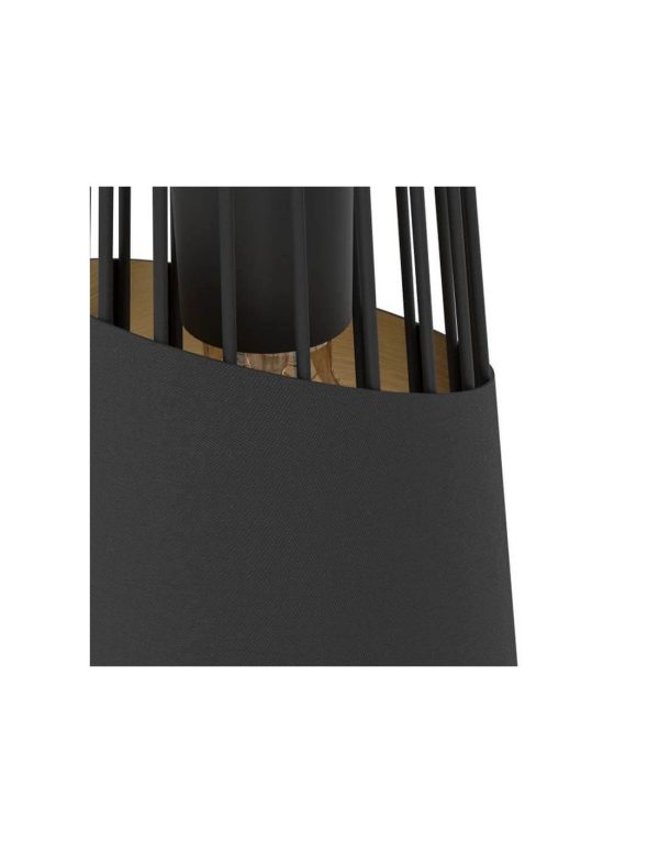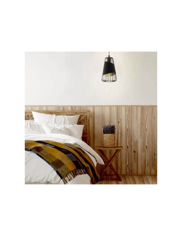 Esta lámpara de techo colgante destaca por su diseño moderno con tiras de acero negro y un elegante interior en color dorado que realza la luz emitida. Su estética cuidada aporta personalidad y estilo a cualquier estancia, convirtiéndose en un elemento decorativo clave tanto encendida como apagada. El contraste entre negro y dorado crea una iluminación cálida y envolvente, perfecta para interiores actuales.