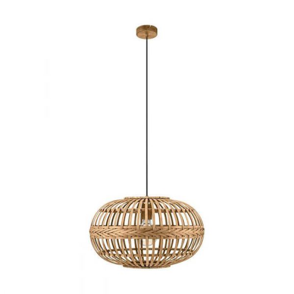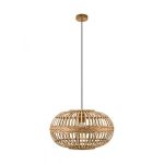 Esta lámpara de techo destaca por su pantalla de madera trenzada en bambú, formada por finas láminas colocadas de manera artesanal que crean un atractivo juego de luces y sombras. Su diseño ovalado semitransparente permite que la bombilla quede parcialmente visible, aportando un efecto decorativo cálido y muy envolvente en cualquier estancia interior.