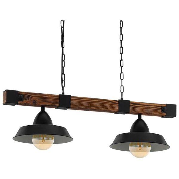 Estructura de madera natural con pantallas de acero negro y diseño vintage, aporta iluminación decorativa cálida y carácter rústico a salones, comedores y espacios interiores.