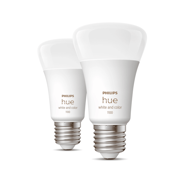Este pack incluye dos bombillas Philips Hue White & Color A60 con 1100 lúmenes, ideales para iluminar espacios amplios como salones, cocinas o dormitorios. Ofrecen luz blanca cálida o fría y millones de colores para crear ambientes totalmente personalizados.