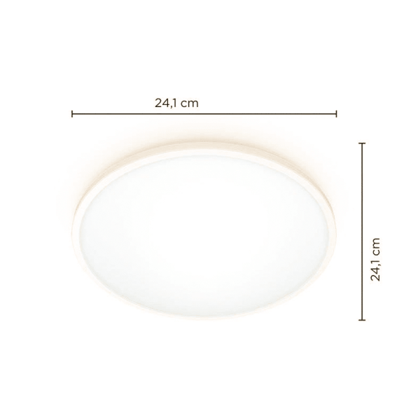 Plafón SuperSlim WIZ 14W con luz regulable 2700K-6500K, control WiFi-Bluetooth y tecnología SpaceSense. Diseño ultrafino en blanco con LED integrado de 1300 lúmenes.