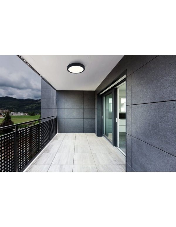 Este plafón LED exterior destaca por su diseño redondo en acabado negro, ideal para integrarse de forma discreta y moderna en todo tipo de espacios al aire libre. Su estética contemporánea permite instalarlo en fachadas, porches, terrazas o zonas de paso exteriores, aportando una iluminación funcional sin renunciar al estilo.