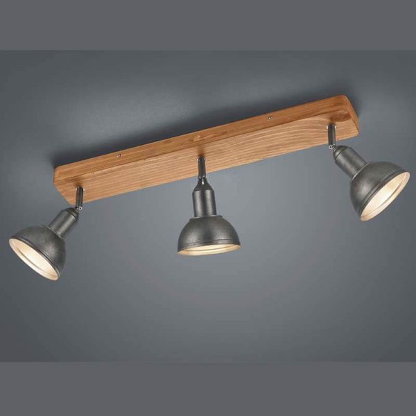 La regleta de 3 focos Delhi combina estilo industrial con focos orientables y base efecto madera, ideal para iluminar interiores con personalidad.