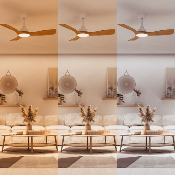 Combina estilo natural y funcionalidad con este ventilador de techo LED, que ofrece motor DC silencioso, 3 velocidades y tres tonalidades en un diseño blanco con madera.